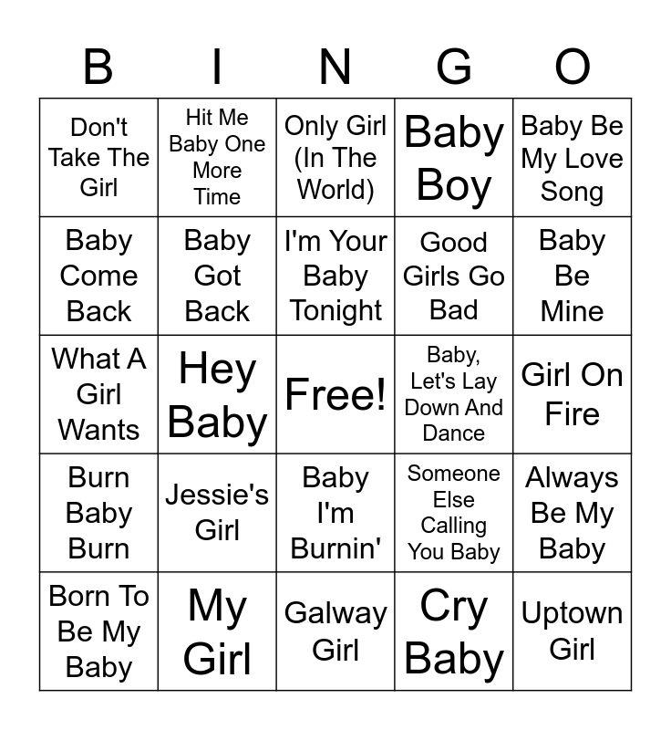 This bingo card has a free space and 49 words: Brown Eyed Girl, Uptown Girl, Material Girl, Galway Girl, Jessie's Girl, In Love With A Girl, Hit Me Baby One More Time, Baby, Baby Come Back, Ice Ice Baby, Baby Got Back, Baby Boy, Always Be My Baby, Someone Else Calling You Baby, There Goes My Baby, When She Says Baby, I'm Your Baby Tonight, Baby, Let's Lay Down And Dance, Hey Baby (Drop It To The Floor), Baby Be My Love Song, Hey Baby, Cry Baby, Don't Take The Girl, Good Girls Go Bad, Be My Baby, Baby Be Mine, Born To Be My Baby, By My Baby Tonight, Baby I'm Burnin', Burn Baby Burn, Come On Over Baby, Baby It's Cold Outside, Santa Baby, Christmas (Baby Please Come Home), My Girl, Girls Just Wanna Fun, Girls, Girls, Girls, Hollaback Girl, Girl On Fire, Bad Girls, Pretty Girl Rock, Girl Crush, Good Girl, Big Girls Don't Cry, What A Girl Wants, Only Girl (In The World), Are You Gonna Be My Girl, Kiss A Girl and Country Girl (Shake It For Me).