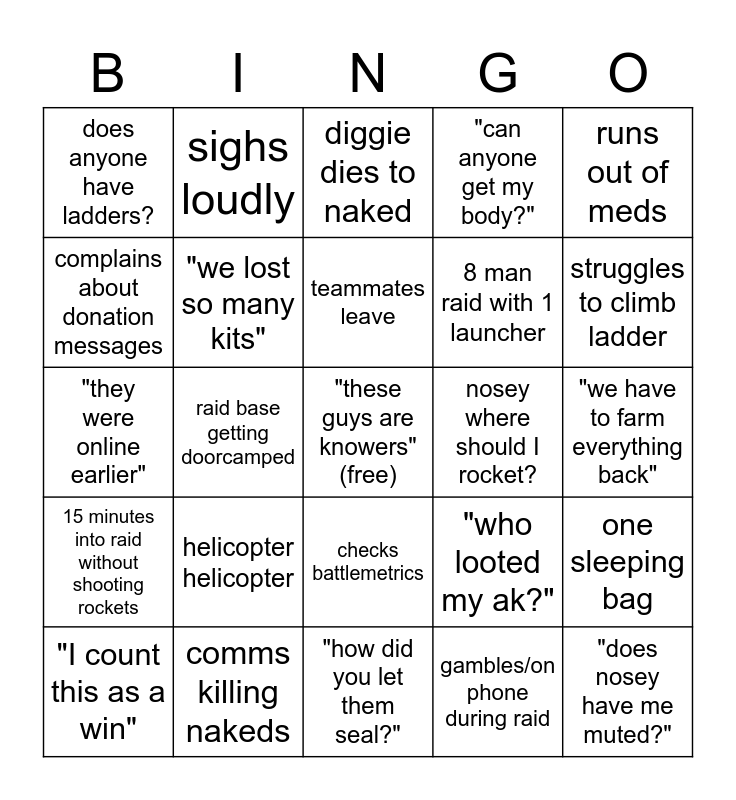 This bingo card has a free space and 24 words: helicopter helicopter, comms killing nakeds, teammates leave, "I count this as a win", runs out of meds, does anyone have ladders?, complains about donation messages, sighs loudly, nosey where should I rocket?, checks battlemetrics, 8 man raid with 1 launcher, "they were online earlier", "who looted my ak?", one sleeping bag, "we lost so many kits", gambles/on phone during raid, "we have to farm everything back", diggie dies to naked, struggles to climb ladder, raid base getting doorcamped, "does nosey have me muted?", 15 minutes into raid without shooting rockets, "can anyone get my body?" and "how did you let them seal?".