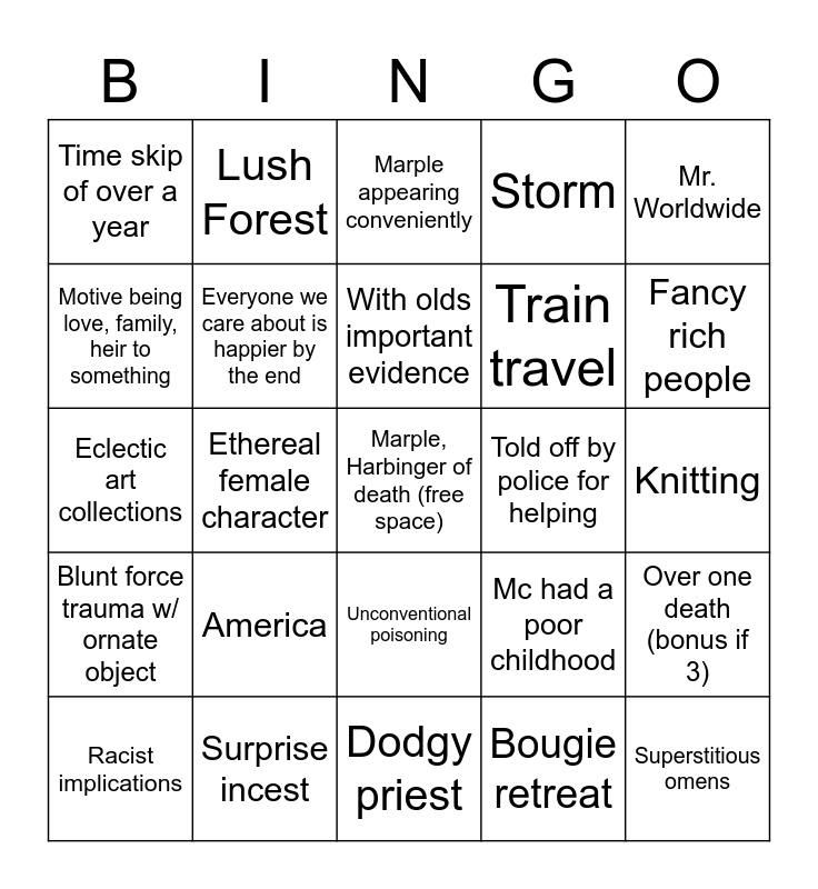 This bingo card has a free space and 29 words: Racist implications, Love interests, Ethereal female character, Nephew Raymond, Time skip of over a year, Marple appearing conveniently, Everyone we care about is happier by the end, America, Told off by police for helping, Surprise incest, Knitting, Superstitious omens, Dodgy priest, Bougie retreat, Fancy rich people, One of Marple's old friends, Unconventional poisoning, Blunt force trauma w/ ornate object, Mr. Worldwide, Eclectic art collections, Mc had a poor childhood, Exposition via bougie restaurant diner, Train travel, Motive being love, family, heir to something, Storm, Lush Forest, Over one death (bonus if 3), With olds important evidence and Fancy and/or eccentric Germanic character.