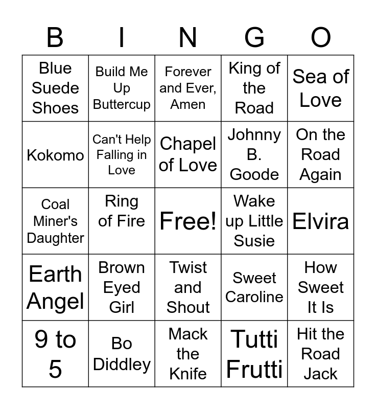 This bingo card has a free space and 29 words: 9 to 5, Highwayman, Ring of Fire, Hound Dog, Blue Suede Shoes, Forever and Ever, Amen, Can't Help Falling in Love, Brown Eyed Girl, Wake up Little Susie, Bo Diddley, Elvira, Hit the Road Jack, Mack the Knife, Tutti Frutti, On the Road Again, Sugar, Sugar, Twist and Shout, Earth Angel, Sea of Love, Coal Miner's Daughter, Sweet Caroline, Respect, Johnny B. Goode, Kokomo, King of the Road, Build Me Up Buttercup, How Sweet It Is, Chapel of Love and the Dock of the Bay.