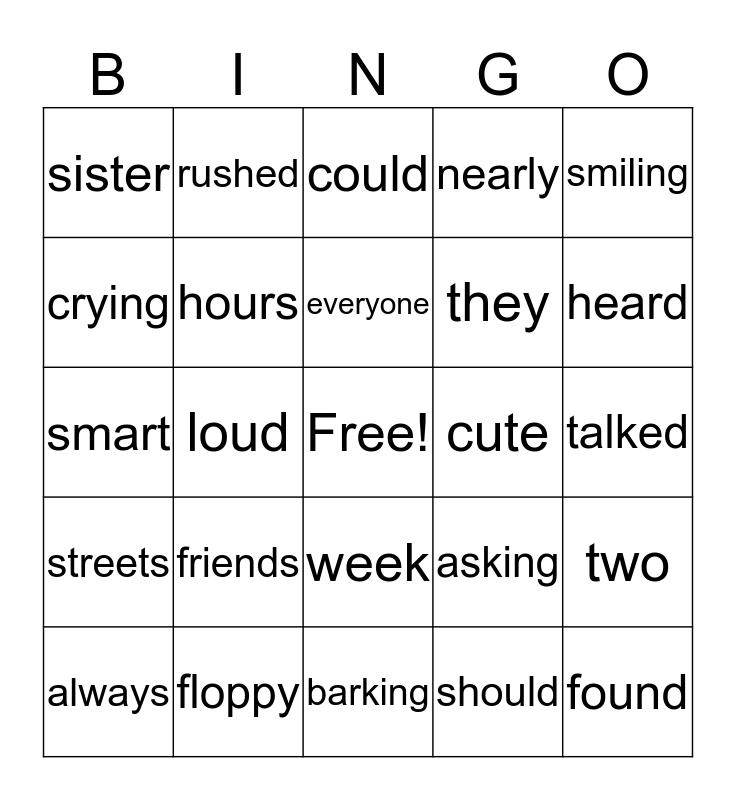 This bingo card has a free space and 24 words: friends, floppy, everyone, always, smiling, sister, crying, rushed, cute, week, they, smart, asking, two, hours, should, talked, could, heard, loud, found, streets, nearly and barking.