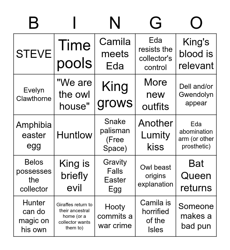 This bingo card has a free space and 33 words: Camila puts glyphs on her baseball bat, The collector collects something, Huntlow, collector's parents, Belos possesses the collector, "We are the owl house", King's blood is relevant, Hunter can do magic on his own, Time pools, Harpy Lilith, King grows, Camila meets Eda, Collector redemption arc, Wittebane brothers flashback, Another Lumity kiss, Dell and/or Gwendolyn appear, Giraffes return to their ancestral home (or a collector wants them to), Amphibia easter egg, King is briefly evil, Owl beast origins explanation, Gravity Falls Easter Egg, Hooty origins explanation, STEVE, Eda abomination arm (or other prosthetic), Hooty commits a war crime, Someone makes a bad pun, Eda resists the collector's control, More new outfits, Evelyn Clawthorne, Bat Queen returns, Titan trappers, Camila is horrified of the Isles and Camila fits right in in the Isles.