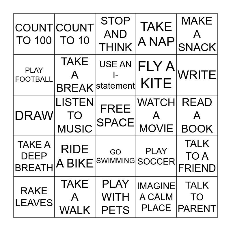 This bingo card has a free space and 24 words: RIDE A BIKE, TAKE A WALK, USE AN I-statement, RAKE LEAVES, MAKE A SNACK, COUNT TO 100, PLAY FOOTBALL, COUNT TO 10, WATCH A MOVIE, GO SWIMMING, FLY A KITE, DRAW, PLAY SOCCER, TALK TO A FRIEND, TAKE A BREAK, IMAGINE A CALM PLACE, READ A BOOK, STOP AND THINK, WRITE, LISTEN TO MUSIC, TALK TO PARENT, TAKE A DEEP BREATH, TAKE A NAP and PLAY WITH PETS.