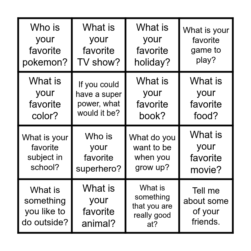 This bingo card has 16 words: What is your favorite animal?, What is your favorite movie?, What is your favorite holiday?, Who is your favorite pokemon?, What is your favorite subject in school?, What is your favorite TV show?, What do you want to be when you grow up?, What is something that you are really good at?, What is your favorite color?, If you could have a super power, what would it be?, What is something you like to do outside?, What is your favorite game to play?, Who is your favorite superhero?, What is your favorite food?, What is your favorite book? and Tell me about some of your friends..