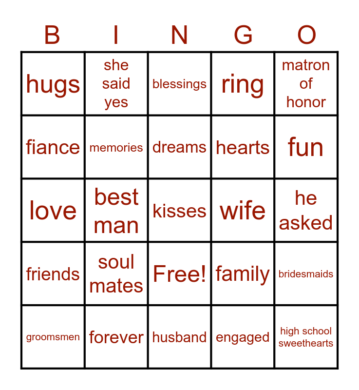 This bingo card has 26 words: Free!, engaged, dreams, forever, matron of honor, hugs, fiance, she said yes, he asked, family, hearts, love, bridesmaids, groomsmen, best man, maid of honor, ring, friends, blessings, kisses, fun, husband, wife, soul mates, memories and high school sweethearts.