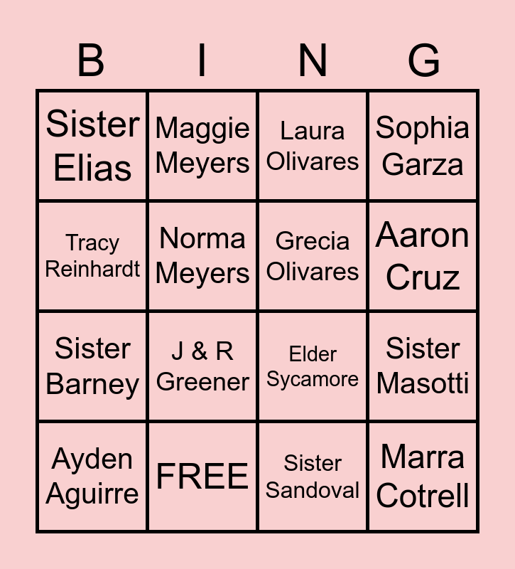 This bingo card has 16 words: FREE, Sister Masotti, Laura Olivares, Sister Elias, Sister Barney, Maggie Meyers, Elder Sycamore, Sister Sandoval, Tracy Reinhardt, Norma Meyers, Ayden Aguirre, Sophia Garza, J & R Greener, Aaron Cruz, Grecia Olivares and Marra Cotrell.