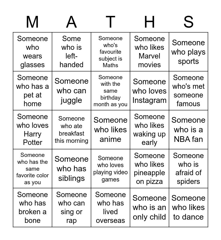 This bingo card has 25 words: Someone who has siblings, Someone who has lived overseas, Someone with the same birthday month as you, Someone who has broken a bone, Someone who plays sports, Someone who wears glasses, Someone who has a pet at home, Some who is left-handed, Someone who likes waking up early, Someone who loves playing video games, Someone who loves Instagram, Someone who loves Harry Potter, Someone who likes pineapple on pizza, Someone who is afraid of spiders, Someone who can juggle, Someone who likes to dance, Someone who is a NBA fan, Someone who's favourite subject is Maths, Someone who's met someone famous, Someone who ate breakfast this morning, Someone who likes anime, Someone who can sing or rap, Someone who has the same favorite color as you, Someone who likes Marvel movies and Someone who is an only child.