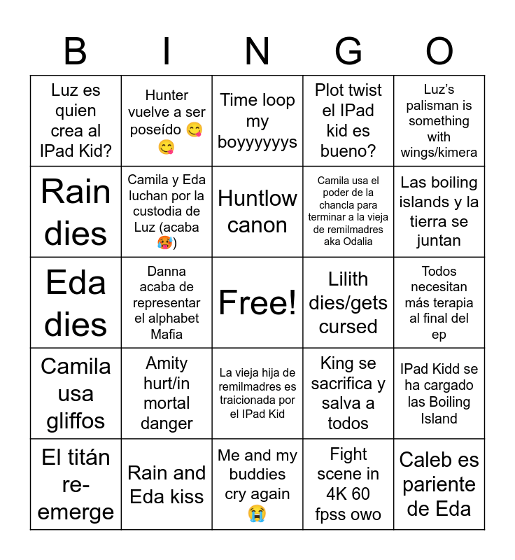 This bingo card has a free space and 24 words: Amity hurt/in mortal danger, Rain and Eda kiss, Huntlow canon, El titán re-emerge, Luz’s palisman is something with wings/kimera, Luz es quien crea al IPad Kid?, Rain dies, Hunter vuelve a ser poseído 😋😋, Lilith dies/gets cursed, La vieja hija de remilmadres es traicionada por el IPad Kid, Camila usa el poder de la chancla para terminar a la vieja de remilmadres aka Odalia, Eda dies, King se sacrifica y salva a todos, IPad Kidd se ha cargado las Boiling Island, Camila y Eda luchan por la custodia de Luz (acaba 🥵), Fight scene in 4K 60 fpss owo, Todos necesitan más terapia al final del ep, Time loop my boyyyyyys, Las boiling islands y la tierra se juntan, Danna acaba de representar el alphabet Mafia, Caleb es pariente de Eda, Camila usa gliffos, Plot twist el IPad kid es bueno? and Me and my buddies cry again 😭.