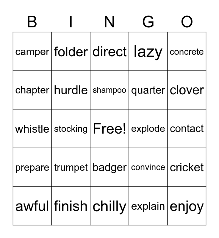 This bingo card has a free space and 24 words: trumpet, finish, shampoo, awful, concrete, camper, chapter, folder, explode, badger, quarter, whistle, convince, cricket, hurdle, explain, contact, direct, clover, stocking, enjoy, prepare, lazy and chilly.