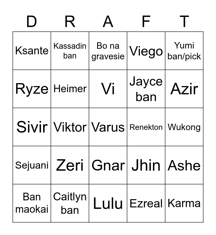 This bingo card has a free space and 24 words: Zeri, Caitlyn ban, Vi, Ban maokai, Yumi ban/pick, Ksante, Ryze, Kassadin ban, Renekton, Gnar, Jayce ban, Sivir, Jhin, Ashe, Heimer, Ezreal, Wukong, Bo na gravesie, Azir, Viktor, Karma, Sejuani, Viego and Lulu.