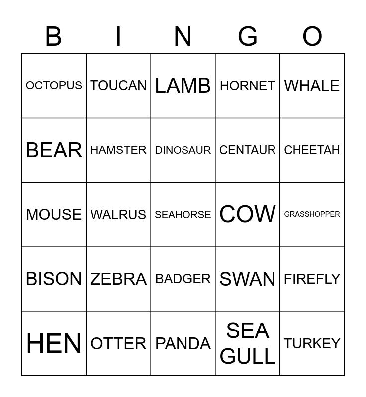 This bingo card has 25 words: ZEBRA, PANDA, DINOSAUR, HEN, WHALE, OCTOPUS, BEAR, TOUCAN, COW, BADGER, CENTAUR, MOUSE, SWAN, FIREFLY, HAMSTER, TURKEY, GRASSHOPPER, LAMB, CHEETAH, WALRUS, SEAHORSE, OTTER, BISON, HORNET and SEA GULL.