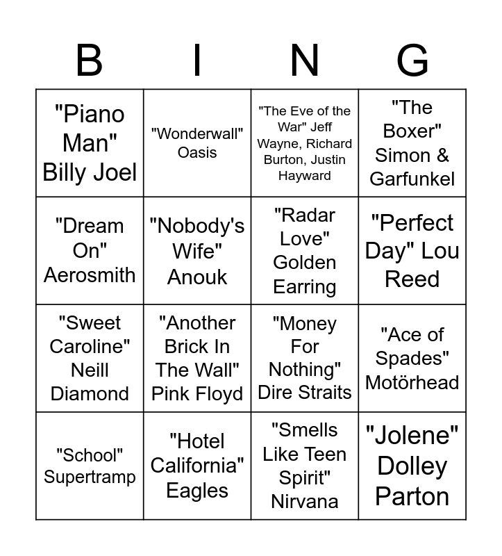 This bingo card has 30 words: "Old Man" Neill Young, "Kayleigh" Marillon, "Ace of Spades" Motörhead, "Year of the Cat" Al Stewart, "Piano Man" Billy Joel, "The Eve of the War" Jeff Wayne, Richard Burton, Justin Hayward, "Radar Love" Golden Earring, "Bohemian Rhapsody" Queen, "Hotel California" Eagles, "Thunderstruck" AC/DC, "Smells Like Teen Spirit" Nirvana, "School" Supertramp, "Paint It, Black" Rolling Stones, "Don't Stop Me Now" Queen, "Another Brick In The Wall" Pink Floyd, "Clocks" Coldplay, "Suspicious Minds" Elvis Presley, "Jolene" Dolley Parton, "Losing My Religion" R.E.M., "Dream On" Aerosmith, "Money For Nothing" Dire Straits, "Paradise City" Guns N'Roses, "Wonderwall" Oasis, "Sweet Caroline" Neill Diamond, "Nobody's Wife" Anouk, "The Boxer" Simon & Garfunkel, "Don't You" Simple Minds, "Saturday Night" Herman Brood & His Wild Romance, "Perfect Day" Lou Reed and "Still Got The Blues" Gary Moore.