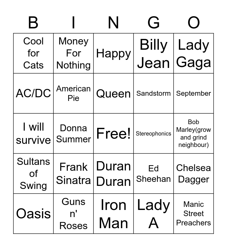 This bingo card has a free space and 28 words: Chelsea Dagger, Keep on Running, Sandstorm, Lady A, AC/DC, Happy, Money For Nothing, Sultans of Swing, Stereophonics, Oasis, I will survive, Billy Jean, Guns n' Roses, Iron Man, September, Beatles, Frank Sinatra, American Pie, Queen, Duran Duran, Cool for Cats, Bob Dylan, Manic Street Preachers, Donna Summer, Bob Marley(grow and grind neighbour), Ed Sheehan, Lady Gaga and Status Quo.