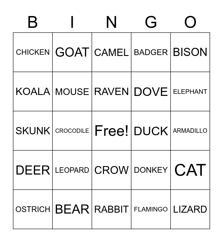 This bingo card has a free space and 70 words: ANT, ARMADILLO, ANTEATER, BOBCAT, BEAR, BIRDS, BADGER, BUGS, BISON, BEES, CAT, COW, CHICKEN, CAMEL, CHEETAH, CROCODILE, CROW, DOVE, DOG, DEER, DUCK, DONKEY, ELEPHANT, ELK, EMU, FROG, FOX, FERRET, FLAMINGO, GIRAFFEE, GOAT, GORILLA, GAZELLE, HAWK, HIPPOPOTAMUS, HORSE, INSECTS, HAMSTER, KANGAROO, KOALA, LION, LEOPARD, LIZARD, MONKEY, MOOSE, MOUSE, OSTRICH, OWL, OTTER, OXEN, PANDA, PENGUIN, PIG, RACCOON, RABBIT, RHINOCEROS, RAVEN, SHEEP, SNAKE, SQUIRREL, SKUNK, SLOTH, SPIDER, SEA LION, SCROPION, TIGER TURTLE, TURKEY, WALRUS, WOLF and ZEBRA.