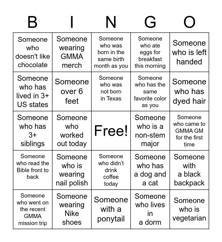This bingo card has a free space and 24 words: Someone who is wearing nail polish, Someone wearing Nike shoes, Someone who was not born in Texas, Someone who went on the recent GMMA mission trip, Someone who is left handed, Someone who doesn't like chocolate, Someone who has lived in 3+ US states, Someone wearing GMMA merch, Someone who is a non-stem major, Someone who didn’t drink coffee today, Someone who has the same favorite color as you, Someone who has 3+ siblings, Someone who has a dog and a cat, Someone with a black backpack, Someone over 6 feet, Someone who lives in a dorm, Someone who came to GMMA GM for the first time, Someone who was born in the same birth month as you, Someone who has dyed hair, Someone who worked out today, Someone who is vegetarian, Someone who read the Bible front to back, Someone who ate eggs for breakfast this morning and Someone with a ponytail.