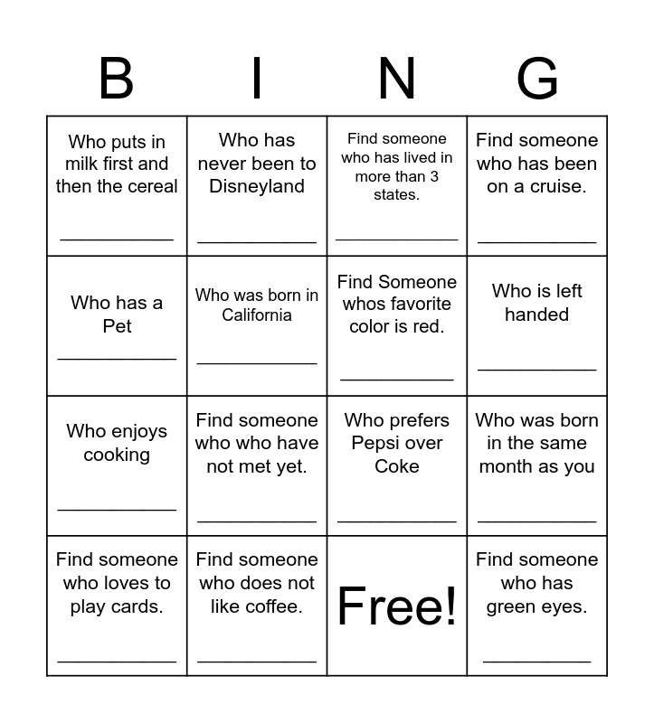 This bingo card has 26 words: Who plays an instrument ____________, Who is a middle child ___________, Who is left handed ___________, Who has backpacked across Europe (at least 3 countries) ____________, Who has a Pet ___________, Who puts in milk first and then the cereal ___________, Who was born in California _____________, Who has never been to Disneyland ___________, Free!, Who is a vegetarian __________, Who enjoys cooking ___________, Who prefers Pepsi over Coke ___________, Who speaks another language. ____________, Who is taking 16 credit hours this semester __________, Who was born in the same month as you ___________, Who is shorter than you _____________, Find someone who has been on a cruise. ___________, Find someone who has green eyes. __________, Find someone who has lived in more than 3 states. ______________, Find someone who loves to play cards. ___________, Find someone who who have not met yet. ___________, Find someone who is an only Child. ___________, Find someone who does not like coffee. ___________, Find someone who has met a famous person. _____________, Find Someone whos favorite color is red. ___________ and Find someone who is wearing a blue shirt. ____________.