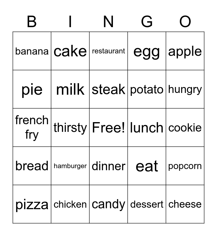 This bingo card has a free space and 24 words: hamburger, chicken, steak, pizza, apple, banana, pie, cake, lunch, dinner, potato, french fry, eat, popcorn, milk, dessert, cookie, restaurant, hungry, thirsty, cheese, bread, egg and candy.