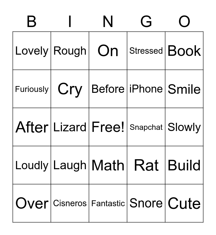 This bingo card has a free space and 24 words: Laugh, Cisneros, Before, Over, Book, Lovely, Furiously, Rough, Snapchat, Math, iPhone, After, Rat, Build, Cry, Snore, Slowly, On, Smile, Lizard, Cute, Loudly, Stressed and Fantastic.
