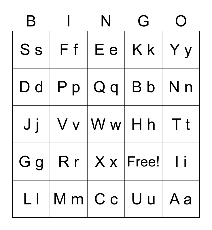 This bingo card has 27 words: Free!, A a, B b, C c, D d, E e, F f, G g, H h, I i, J j, K k, L l, M m, N n, O o, P p, Q q, R r, S s, T t, U u, V v, W w, X x, Y y and Z z.