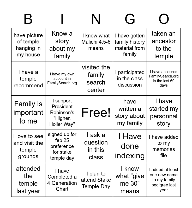 This bingo card has a free space and 24 words: signed up for feb 25 preference for stake temple day, I have Completed a 4 Generation Chart, visited the family search center, attended the temple last year, taken an ancestor to the temple, have picture of temple hanging in my house, I have a temple recommend, Know a story about my family, have written a story about my family, I ask a question in this class, I participated in the class discussion, Family is important to me, I Have done indexing, I have added to my memories file, I have my own account in FamilySearch,org, I know what "give me 30" means, I have started my personnal story, I know what Malichi 4:5-6 means, I have accessed FamilySearch.org in the last 60 days, I support President Robinson's "Higher, Holier Way", I added at least one new name to my family pedigree last year, I love to see and visit the temple grounds, I have gotten family history material from family and I plan to attend Stake Temple Day.