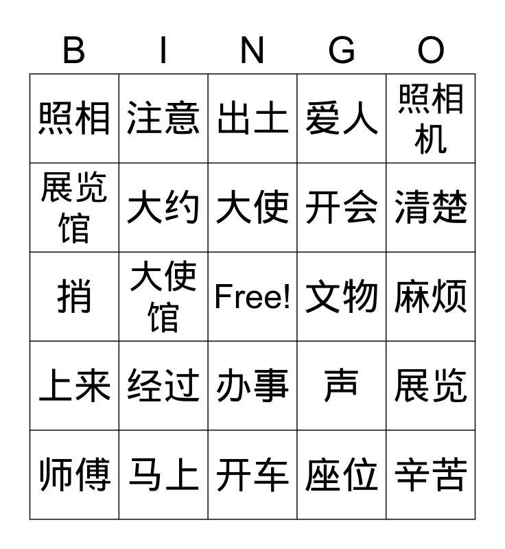 This bingo card has a free space and 25 words: 上来, 马上, 开车, 座位, 照相机, 照相, 注意, 出土, 文物, 展览, 展览馆, 大约, 要求, 声, 清楚, 师傅, 大使馆, 大使, 开会, 麻烦, 捎, 经过, 办事, 爱人 and 辛苦.