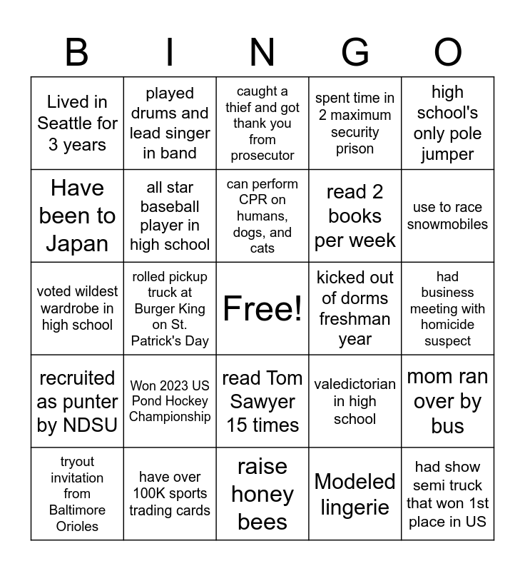 This bingo card has a free space and 24 words: Won 2023 US Pond Hockey Championship, have over 100K sports trading cards, can perform CPR on humans, dogs, and cats, tryout invitation from Baltimore Orioles, high school's only pole jumper, Lived in Seattle for 3 years, Have been to Japan, played drums and lead singer in band, kicked out of dorms freshman year, read Tom Sawyer 15 times, read 2 books per week, voted wildest wardrobe in high school, valedictorian in high school, mom ran over by bus, all star baseball player in high school, Modeled lingerie, had business meeting with homicide suspect, caught a thief and got thank you from prosecutor, use to race snowmobiles, rolled pickup truck at Burger King on St. Patrick's Day, had show semi truck that won 1st place in US, recruited as punter by NDSU, spent time in 2 maximum security prison and raise honey bees.