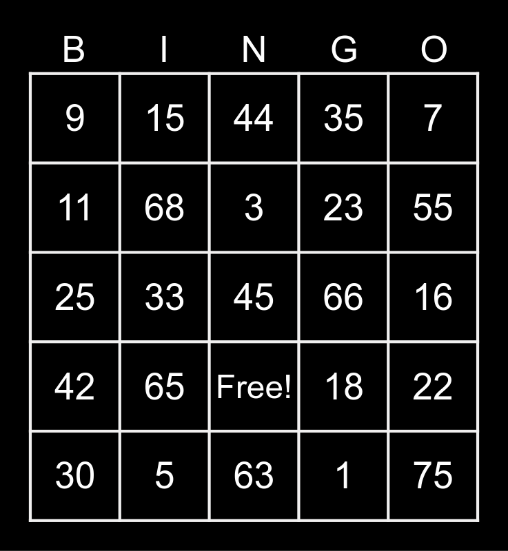 This bingo card has 26 words: Free!, 1, 3, 5, 7, 9, 11, 15, 16, 18, 23, 25, 22, 30, 33, 39, 35, 42, 44, 45, 55, 63, 66, 65, 68 and 75.