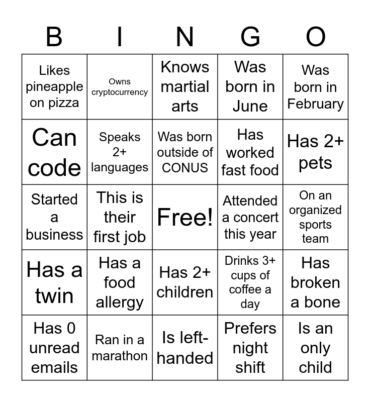 This bingo card has a free space and 29 words: Has 0 unread emails, Has a side hustle, This is their first job, Went viral online, Likes pineapple on pizza, Knows martial arts, Speaks 2+ languages, Has a food allergy, Attended a concert this year, Ran in a marathon, On an organized sports team, Is an only child, Is left-handed, Prefers night shift, Has 2+ pets, Plays a musical instrument, Has 2+ children, Has a twin, Was born in February, Started a business, Drinks 3+ cups of coffee a day, Attended a PDC in the past 6 months, Has worked fast food, Can code, Was born in June, Owns cryptocurrency, Has broken a bone, Was born outside of CONUS and Doesn't have a middle name.
