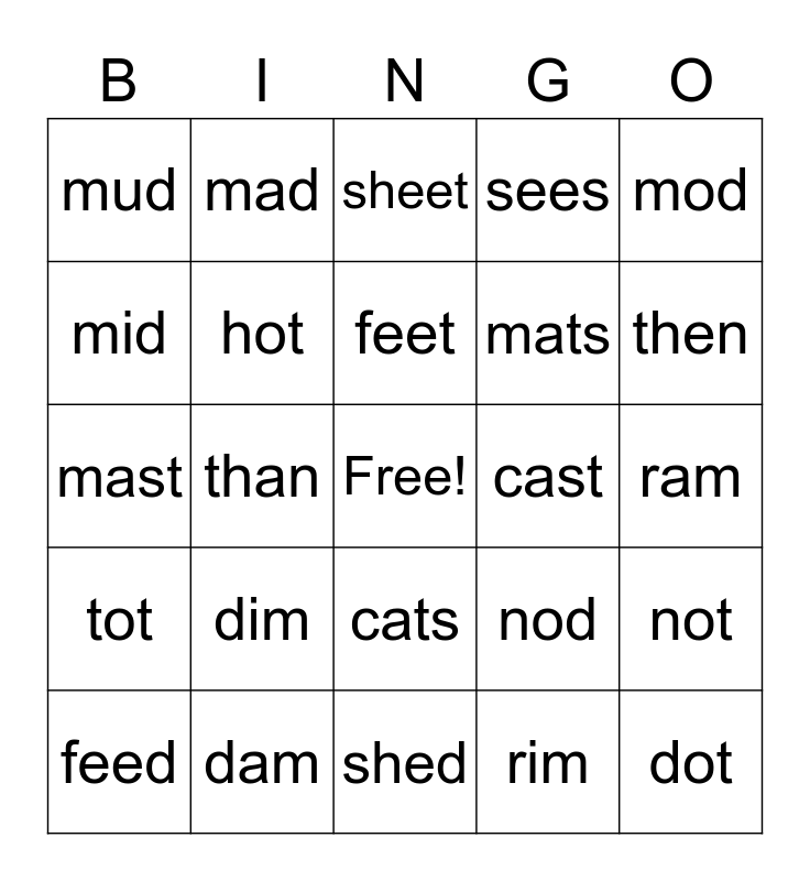 This bingo card has a free space and 24 words: dim, dam, feet, feed, mod, mud, mid, mad, cast, cats, mats, mast, nod, not, hot, rim, ram, sheet, then, than, dot, tot, sees and shed.