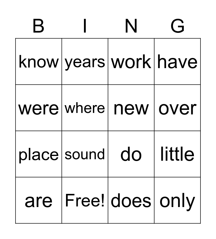 This bingo card has 16 words: Free!, little, work, know, place, years, do, does, were, where, are, have, sound, over, new and only.
