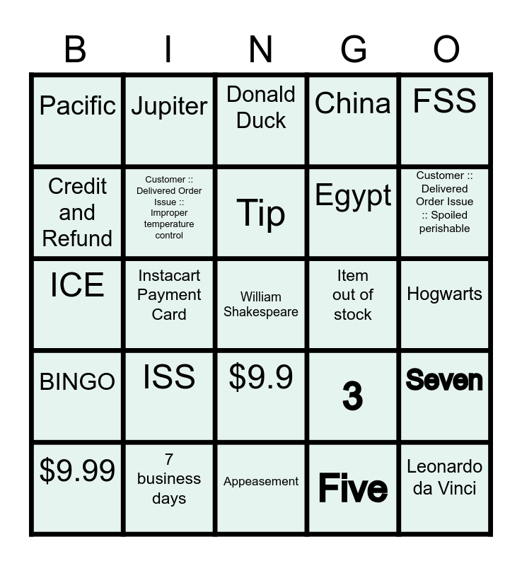 This bingo card has a free space and 24 words: ISS, 7 business days, Tip, $9.99, FSS, Pacific, Credit and Refund, Jupiter, Item out of stock, $9.9, Egypt, ICE, 3, Seven, Customer :: Delivered Order Issue :: Improper temperature control, Five, Hogwarts, Donald Duck, Customer :: Delivered Order Issue :: Spoiled perishable, Instacart Payment Card, Leonardo da Vinci, BINGO, China and Appeasement.