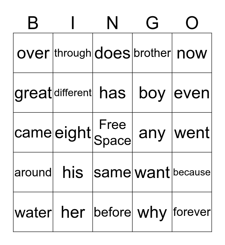 This bingo card has a free space and 24 words: his, her, has, water, now, over, great, through, any, same, boy, came, want, because, different, why, went, does, even, eight, forever, around, brother and before.
