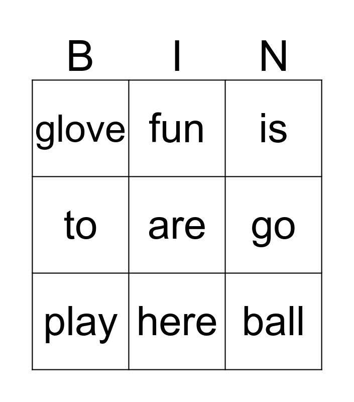 This bingo card has 9 words: play, is, fun, to, glove, go, are, ball and here.