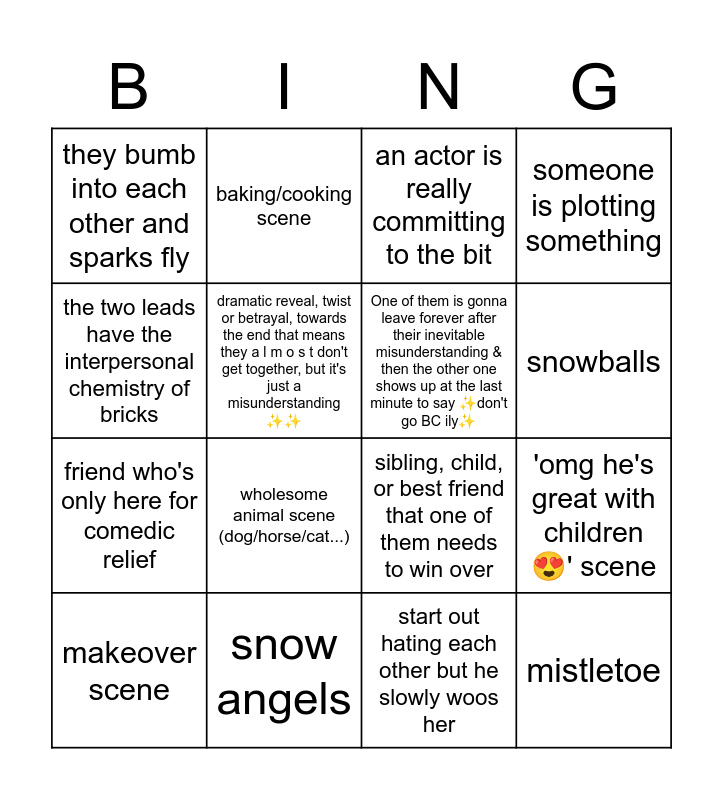 This bingo card has 16 words: snow angels, 'omg he's great with children 😍' scene, an actor is really committing to the bit, they bumb into each other and sparks fly, friend who's only here for comedic relief, baking/cooking scene, sibling, child, or best friend that one of them needs to win over, start out hating each other but he slowly woos her, the two leads have the interpersonal chemistry of bricks, dramatic reveal, twist or betrayal, towards the end that means they a l m o s t don't get together, but it's just a misunderstanding ✨✨, makeover scene, someone is plotting something, wholesome animal scene (dog/horse/cat...), snowballs, One of them is gonna leave forever after their inevitable misunderstanding & then the other one shows up at the last minute to say ✨don't go BC ily✨ and mistletoe.