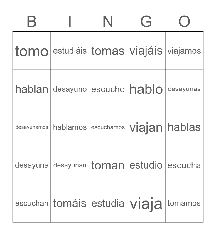 This bingo card has 27 words: estudio, tomamos, hablo, estudia, hablan, tomas, estudiáis, desayuna, viajan, escucha, desayunamos, viajáis, escuchan, tomáis, desayunas, habláis, desayuno, escucho, desayunan, tomo, hablas, viaja, hablamos, escuchamos, toman, viajamos and toma.