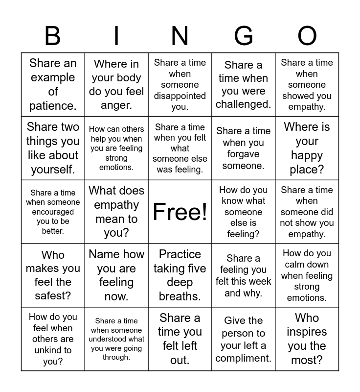 This bingo card has a free space and 24 words: Name how you are feeling now., Share a time when someone understood what you were going through., Share a time when you felt what someone else was feeling., How do you feel when others are unkind to you?, Share a time when someone showed you empathy., Share an example of patience., Share two things you like about yourself., Where in your body do you feel anger., How do you know what someone else is feeling?, Practice taking five deep breaths., Share a time when you forgave someone., Share a time when someone encouraged you to be better., Share a feeling you felt this week and why., How do you calm down when feeling strong emotions., How can others help you when you are feeling strong emotions., Give the person to your left a compliment., Share a time when someone did not show you empathy., Share a time when someone disappointed you., Where is your happy place?, What does empathy mean to you?, Who inspires you the most?, Who makes you feel the safest?, Share a time when you were challenged. and Share a time you felt left out..
