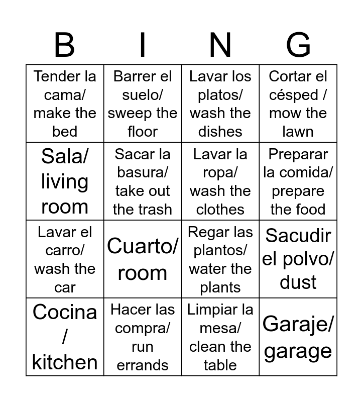 This bingo card has a free space and 15 words: Cocina / kitchen, Garaje/ garage, Lavar los platos/ wash the dishes, Tender la cama/ make the bed, Preparar la comida/ prepare the food, Sala/ living room, Cuarto/ room, Limpiar la mesa/ clean the table, Sacar la basura/ take out the trash, Lavar el carro/ wash the car, Sacudir el polvo/ dust, Cortar el césped / mow the lawn, Lavar la ropa/ wash the clothes, Barrer el suelo/ sweep the floor and Hacer las compra/ run errands.