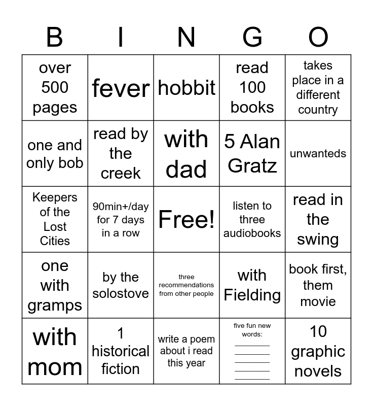 This bingo card has a free space and 24 words: by the solostove, 1 historical fiction, with dad, with mom, takes place in a different country, over 500 pages, one and only bob, fever, listen to three audiobooks, three recommendations from other people, 5 Alan Gratz, Keepers of the Lost Cities, with Fielding, book first, them movie, read by the creek, five fun new words: _________ _________ _________ _________ _________, read in the swing, hobbit, unwanteds, 90min+/day for 7 days in a row, 10 graphic novels, one with gramps, read 100 books and write a poem about i read this year.