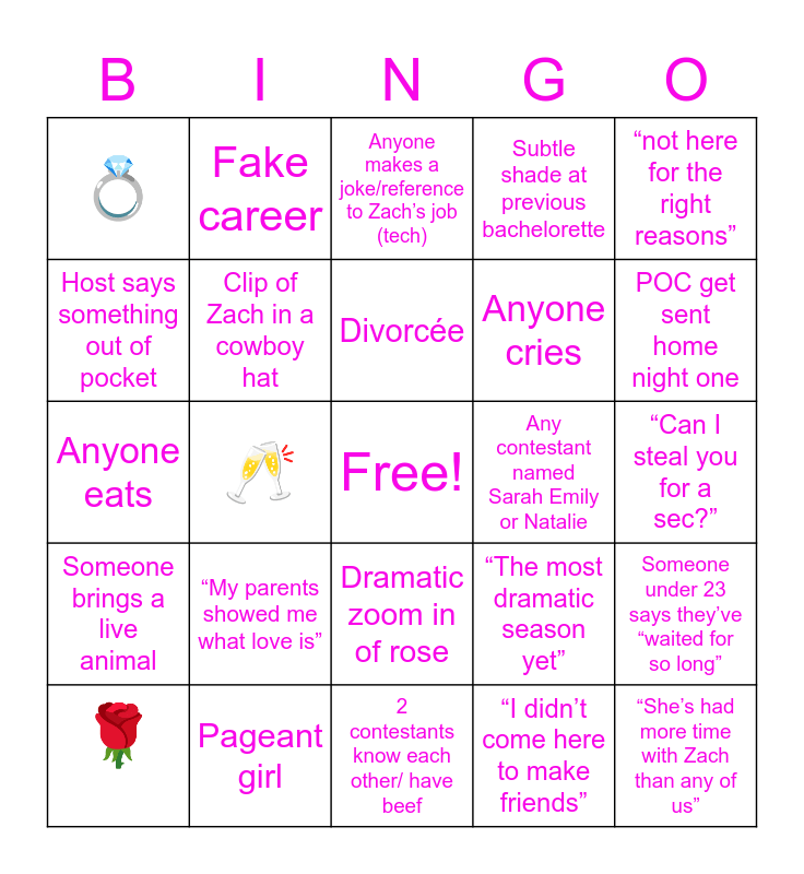 This bingo card has a free space and 29 words: 🌹, 🍾, 🥂, 💕, 💍, Anyone makes a joke/reference to Zach’s job (tech), Clip of Zach in a cowboy hat, “My parents showed me what love is”, Any contestant named Sarah Emily or Natalie, Pageant girl, “Can I steal you for a sec?”, “She’s had more time with Zach than any of us”, 2 contestants know each other/ have beef, “I didn’t come here to make friends”, POC get sent home night one, Clip of Zach surfing, Dramatic zoom in of rose, Someone brings a live animal, “not here for the right reasons”, Anyone eats, “The most dramatic season yet”, Recipient of first impression rose is blonde, Anyone cries, Host says something out of pocket, Subtle shade at previous bachelorette, Fake career, Someone under 23 says they’ve “waited for so long”, Divorcée and Someone quit their job for this.