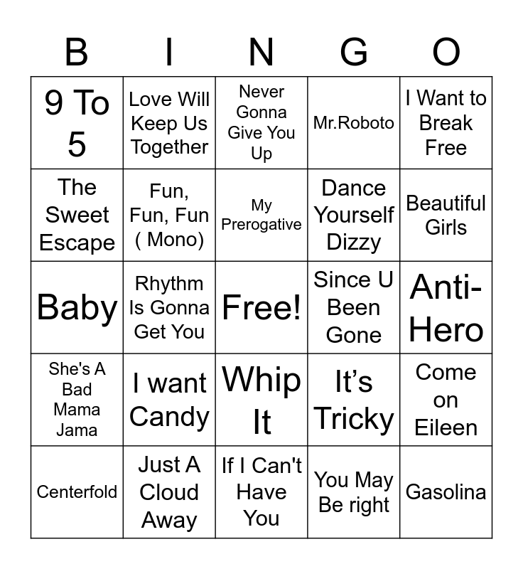 This bingo card has a free space and 70 words: Flower, Anti-Hero, Stay With Me, Music For A Sushi Restaurant, Just A Cloud Away, Put a Little Love In Your Heart, Mr.Roboto, The Safety Dance, I Want to Break Free, Love Grows, Come on Eileen, What Dreams Are Made Of, 9 To 5, Never Gonna Give You Up, Billie Jean, Rhythm Is Gonna Get You, Whip It, Dance Yourself Dizzy, Don't You Want Me Baby, She's A Bad Mama Jama, Since U Been Gone, It’s Tricky, Beautiful Girls, Burnin Up, Wolves, Rude, Hula Hoop, Single Ladies, You May Be right, Mary You, Love Will Keep Us Together, Don't Pull Your Love Out, Fever, Itsy Bitsy Teenie Weenie Yellow Polka-Dot Bikini, Redneck Woman, Somethin' Bad, hole in the bottle, I Like It, I Love It, Lady Marmalade, The Sweet Escape, Rich Girl, I want Candy, Gasolina, Family Affaire, The Ketchup Song, Fun, Fun, Fun ( Mono), Centerfold, Old Time Rock & Roll, Escape ( The Pina Colada Song ), Splish Splash, Callin’ Baton Rouge, Do You Believe In Magic?, Rockin’ Robin, Shape Of You, If I Can't Have You, #SELFIE, My Prerogative, I say A Little Prayer, Telephone, Royals, Baby, Party Rock Anthem, Gangnam Style, Bang!, Umbrella, Run It!, Lose Control, More Than A Woman, American Woman and Blue ( Da Ba Dee).