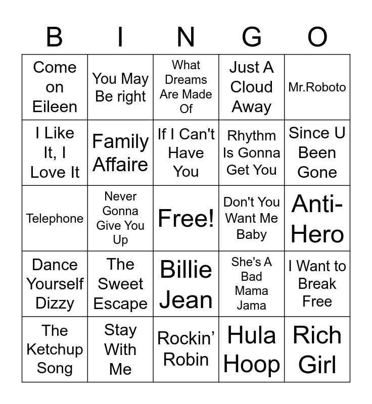This bingo card has a free space and 70 words: Flower, Anti-Hero, You Proof, Like I Love Country Music, Stay With Me, Music For A Sushi Restaurant, Just A Cloud Away, Put a Little Love In Your Heart, Mr.Roboto, The Safety Dance, I Want to Break Free, Love Grows, Come on Eileen, What Dreams Are Made Of, 9 To 5, Never Gonna Give You Up, Billie Jean, Rhythm Is Gonna Get You, Whip It, Dance Yourself Dizzy, Don't You Want Me Baby, She's A Bad Mama Jama, Since U Been Gone, It’s Tricky, Beautiful Girls, Burnin Up, Wolves, Rude, Hula Hoop, Single Ladies, You May Be right, Mary You, Love Will Keep Us Together, Don't Pull Your Love Out, Fever, Itsy Bitsy Teenie Weenie Yellow Polka-Dot Bikini, Redneck Woman, Somethin' Bad, hole in the bottle, I Like It, I Love It, Lady Marmalade, The Sweet Escape, Rich Girl, I want Candy, Gasolina, Family Affaire, The Ketchup Song, Fun, Fun, Fun ( Mono), Centerfold, Old Time Rock & Roll, Escape ( The Pina Colada Song ), Splish Splash, Callin’ Baton Rouge, Do You Believe In Magic?, Rockin’ Robin, Shape Of You, If I Can't Have You, #SELFIE, My Prerogative, I say A Little Prayer, Telephone, Royals, Baby, Party Rock Anthem, Umbrella, Run It!, Lose Control, More Than A Woman, American Woman and Blue ( Da Ba Dee).