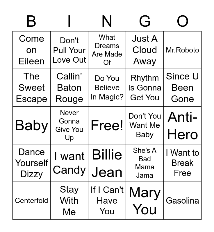 This bingo card has a free space and 69 words: Flower, Anti-Hero, You Proof, Like I Love Country Music, Stay With Me, Music For A Sushi Restaurant, Just A Cloud Away, Put a Little Love In Your Heart, Mr.Roboto, The Safety Dance, I Want to Break Free, Love Grows, Come on Eileen, What Dreams Are Made Of, 9 To 5, Never Gonna Give You Up, Billie Jean, Rhythm Is Gonna Get You, Whip It, Dance Yourself Dizzy, Don't You Want Me Baby, She's A Bad Mama Jama, Since U Been Gone, Wolves, Rude, Hula Hoop, Single Ladies, You May Be right, Mary You, Love Will Keep Us Together, Don't Pull Your Love Out, Fever, Itsy Bitsy Teenie Weenie Yellow Polka-Dot Bikini, Redneck Woman, Somethin' Bad, hole in the bottle, I Like It, I Love It, Lady Marmalade, The Sweet Escape, Rich Girl, I want Candy, Gasolina, Family Affaire, The Ketchup Song, Fun, Fun, Fun ( Mono), Centerfold, Old Time Rock & Roll, Escape ( The Pina Colada Song ), Splish Splash, Callin’ Baton Rouge, Do You Believe In Magic?, Rockin’ Robin, Shape Of You, If I Can't Have You, #SELFIE, My Prerogative, I say A Little Prayer, Telephone, Royals, Baby, Party Rock Anthem, Gangnam Style, Bang!, Umbrella, Run It!, Lose Control, More Than A Woman, American Woman and Blue ( Da Ba Dee).