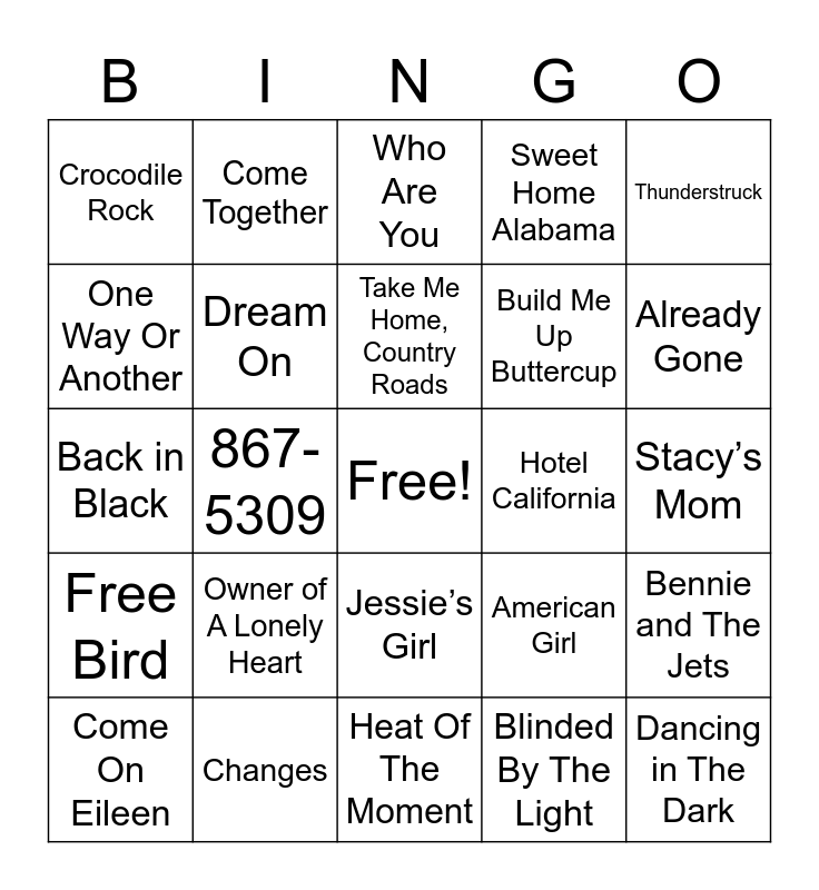 This bingo card has a free space and 35 words: September, Juke Box Hero, Cold as Ice, Dream On, Jessie’s Girl, Sweet Home Alabama, One Way Or Another, Tiny Dancer, Take Me Home, Country Roads, Africa, Back in Black, Thunderstruck, Hooked on A Feeling, Piano Man, Crocodile Rock, Hotel California, Blinded By The Light, 867-5309, Free Bird, Dancing in The Dark, American Girl, Come On Eileen, Bennie and The Jets, Changes, Who Are You, Already Gone, You Can’t Always Get What You Want, Learning To Fly, Build Me Up Buttercup, Stacy’s Mom, Still Haven’t Found What I’m Looking For, Heat Of The Moment, Owner of A Lonely Heart, Come Together and Dream Weaver.