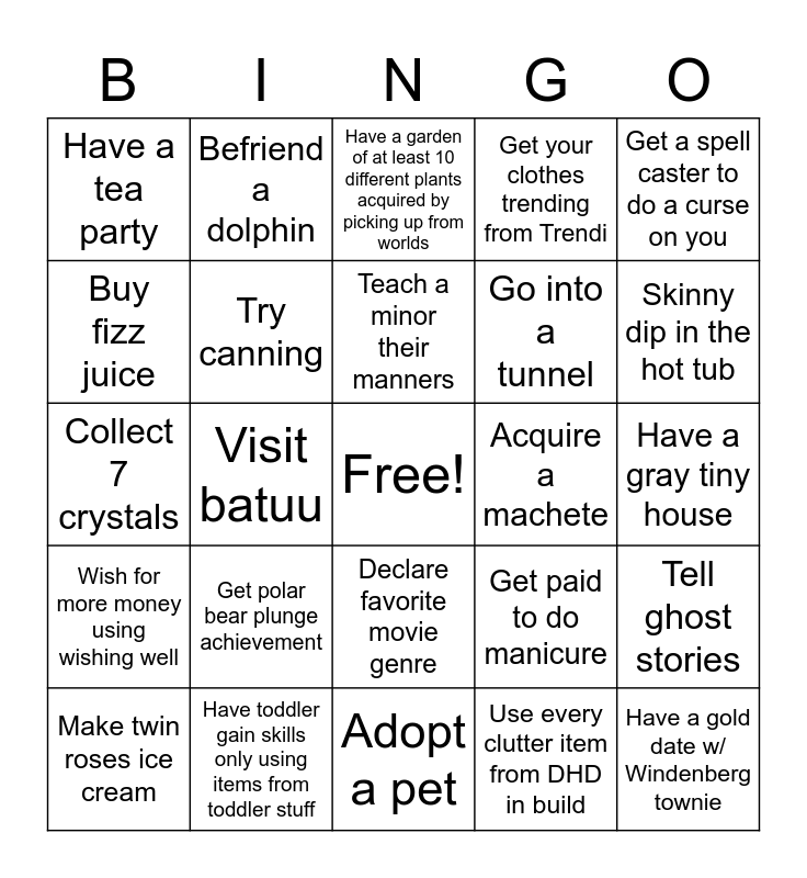 This bingo card has a free space and 49 words: Go shopping in retail store, Have a gold date w/ Windenberg townie, Meet a social media star, Adopt a pet, Get polar bear plunge achievement, Become 1 star celebrity, Befriend a dolphin, Buy a bike, Buy fizz juice, Climb a mountain, Try canning, Get your clothes trending from Trendi, Tell ghost stories, Get paid to do manicure, Order desert at restaurant, Volunteer to let vampire drink from you, Teach a minor their manners, Acquire a machete, Eat a bazzare fruit, Get a spell caster to do a curse on you, Visit batuu, Use every clutter item from DHD in build, Have a tea party, Go into a tunnel, Use the fountain or mirth during a party event, Skinny dip in the hot tub, Make twin roses ice cream, Have a spooky party event, Declare favorite movie genre, Wish for more money using wishing well, Have child win battle of void critters, Get to fitness level 4 using only slip and slide, Use vintage vanity, Go bowling with friends on a Friday night, Have toddler gain skills only using items from toddler stuff, Reach level 3 in rock climbing skill, Use laundry items entire gameplay, Get poisoned by rodent, Have a gray tiny house, Do one gig at photographer, Knit minor a piece of clothing, Get brave reward trait, Get to level 5 of detect agent career, Become a oracle, Collect 7 crystals, Have a garden of at least 10 different plants acquired by picking up from worlds, Visit any secret world, Don’t use any basegame items when building and Have at least 50k by the end of gameplay.