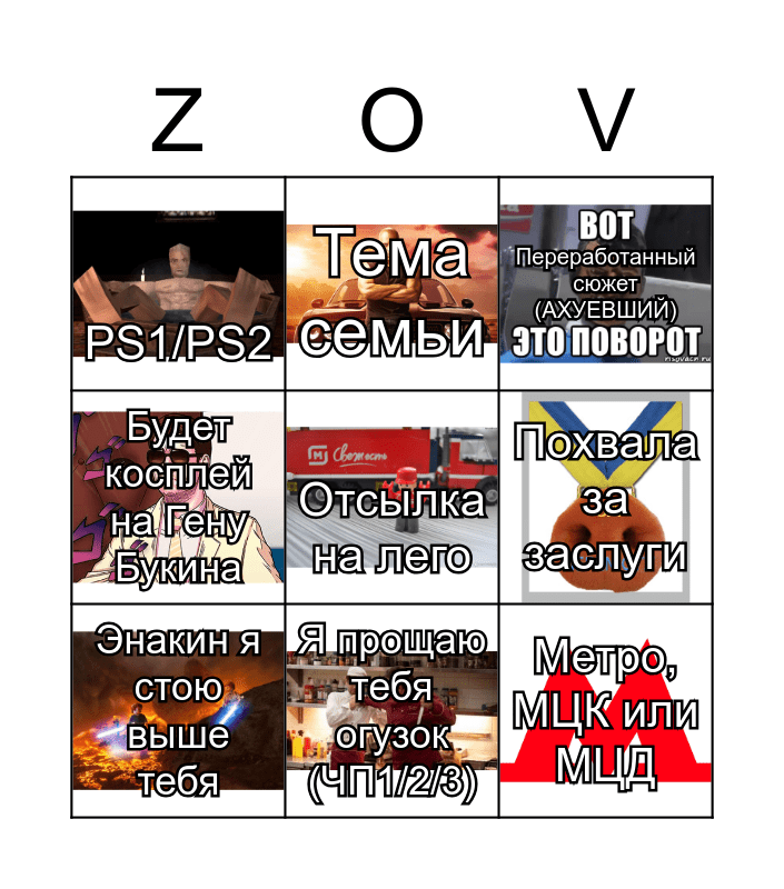 This bingo card has 8 images, a free space and 8 words: Похвала за заслуги, Переработанный сюжет (АХУЕВШИЙ), Тема семьи, Энакин я стою выше тебя, PS1/PS2, Метро, МЦК или МЦД, Будет косплей на Гену Букина and Я прощаю тебя огузок (ЧП1/2/3).