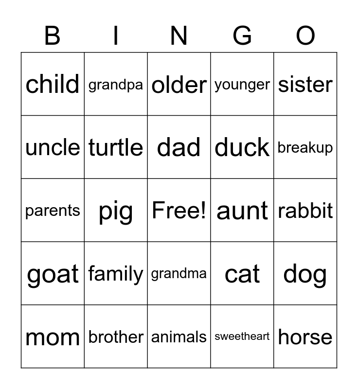 This bingo card has a free space and 24 words: family, brother, dad, mom, sister, child, uncle, grandpa, aunt, grandma, duck, parents, cat, dog, turtle, sweetheart, rabbit, older, breakup, pig, horse, goat, younger and animals.