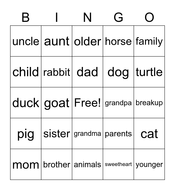 This bingo card has a free space and 24 words: sister, brother, dad, mom, family, uncle, child, aunt, grandpa, grandma, dog, duck, parents, cat, rabbit, sweetheart, breakup, older, turtle, goat, younger, pig, horse and animals.