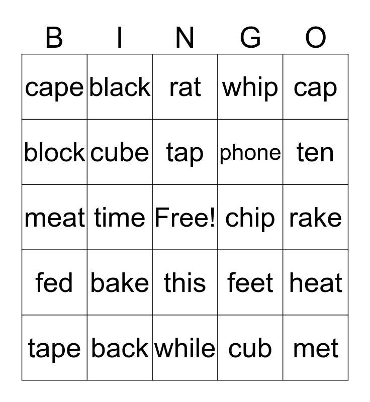 This bingo card has a free space and 24 words: bake, back, tap, tape, cap, cape, block, black, chip, this, phone, meat, feet, heat, cube, cub, rake, rat, ten, time, met, fed, whip and while.