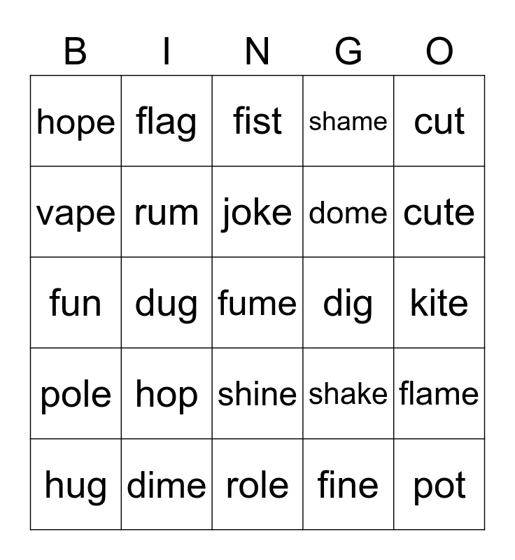 This bingo card has a free space and 29 words: hug, bake, dug, like, hope, fist, rum, hop, dig, dime, kite, pot, role, fine, cute, rope, shine, pole, cut, fun, shake, fuse, dome, vape, shame, flag, flame, joke and bit.