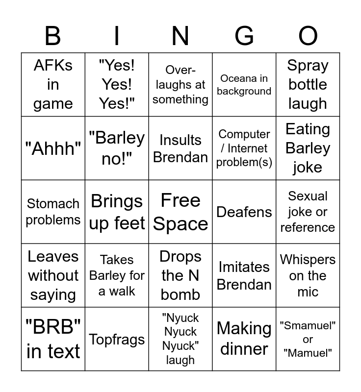 This bingo card has a free space and 24 words: Takes Barley for a walk, Topfrags, Insults Brendan, "BRB" in text, Spray bottle laugh, AFKs in game, "Ahhh", "Yes! Yes! Yes!", Deafens, Drops the N bomb, Computer / Internet problem(s), Stomach problems, Imitates Brendan, Whispers on the mic, "Barley no!", Making dinner, Sexual joke or reference, Over-laughs at something, Eating Barley joke, Brings up feet, "Smamuel" or "Mamuel", Leaves without saying, Oceana in background and "Nyuck Nyuck Nyuck" laugh.